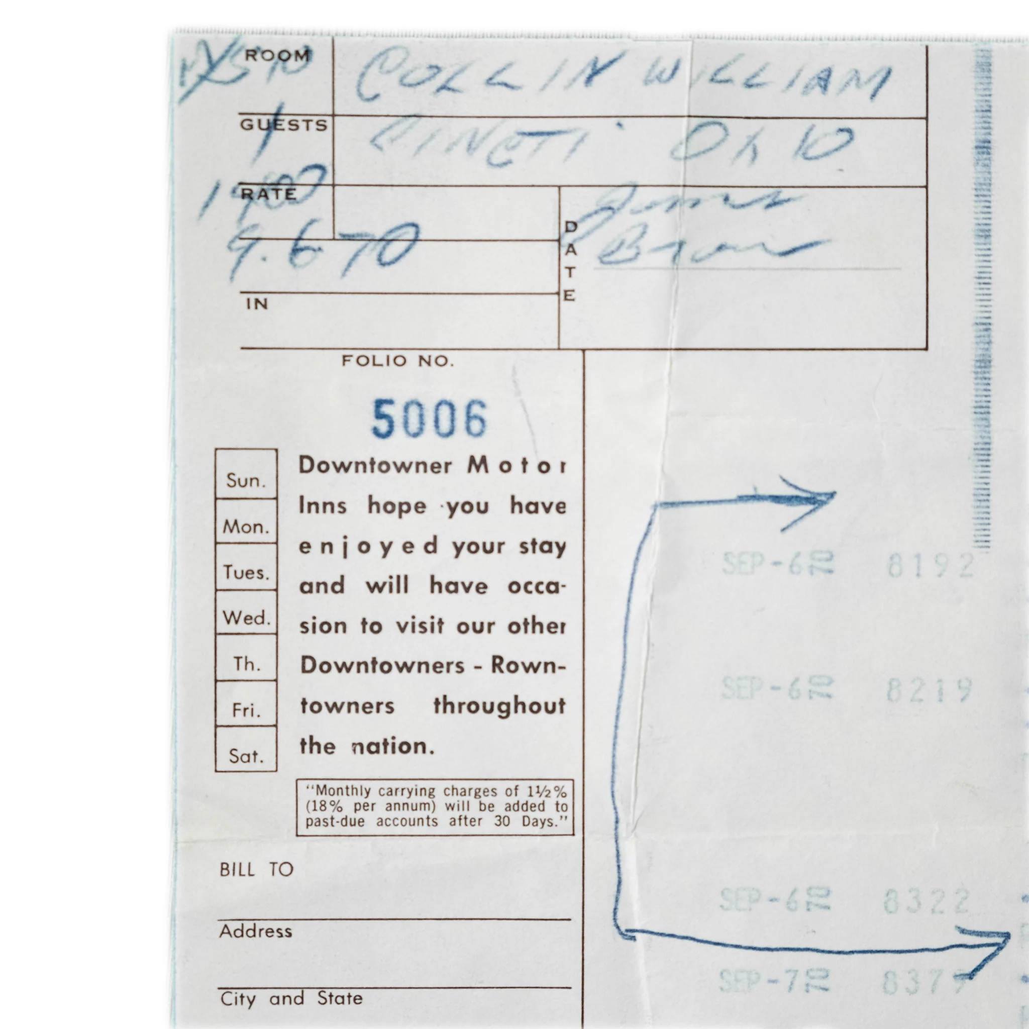 The Downtowner Motor Inn was a chain of mid-priced hotels located in urban city centers, which operated across the United States between the early 1960s and mid-â70s. On the night of Sept. 6, 1970, the Richmond, Virginia location provided accommodations for the J.B.âs, following a tour stop that night with James Brown. This receipt from the stay lists Bootsyâs birth name, William Collins, as the guest and includes a signature from James Brown himself!