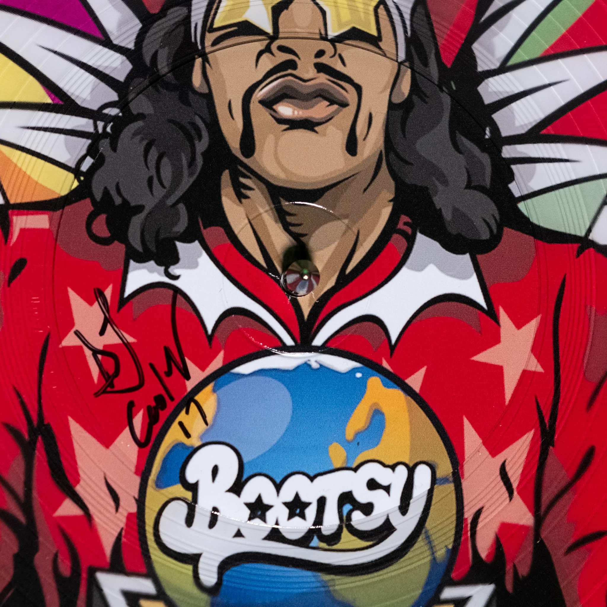 This tie-dye TEAC belt-drive analog turntable, one of only two in existence, was custom made for Bootsy to celebrate his 2017 album World Wide Funk (Mascot Records). The turntable platter, which features the album cover art designed by Bootsy and Francesco âZanoâ Zanotti, is signed by Bootsy and DJ Cool V (of Juice Crew/Biz Markie fame).
